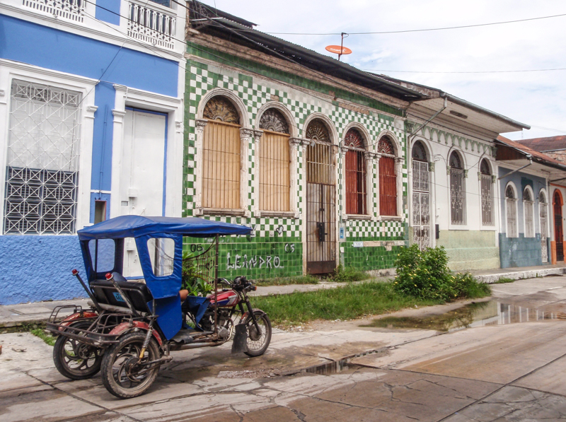 There are very few cars (they must be brought by river), but lots of Colonial-style rubber boom era buildings