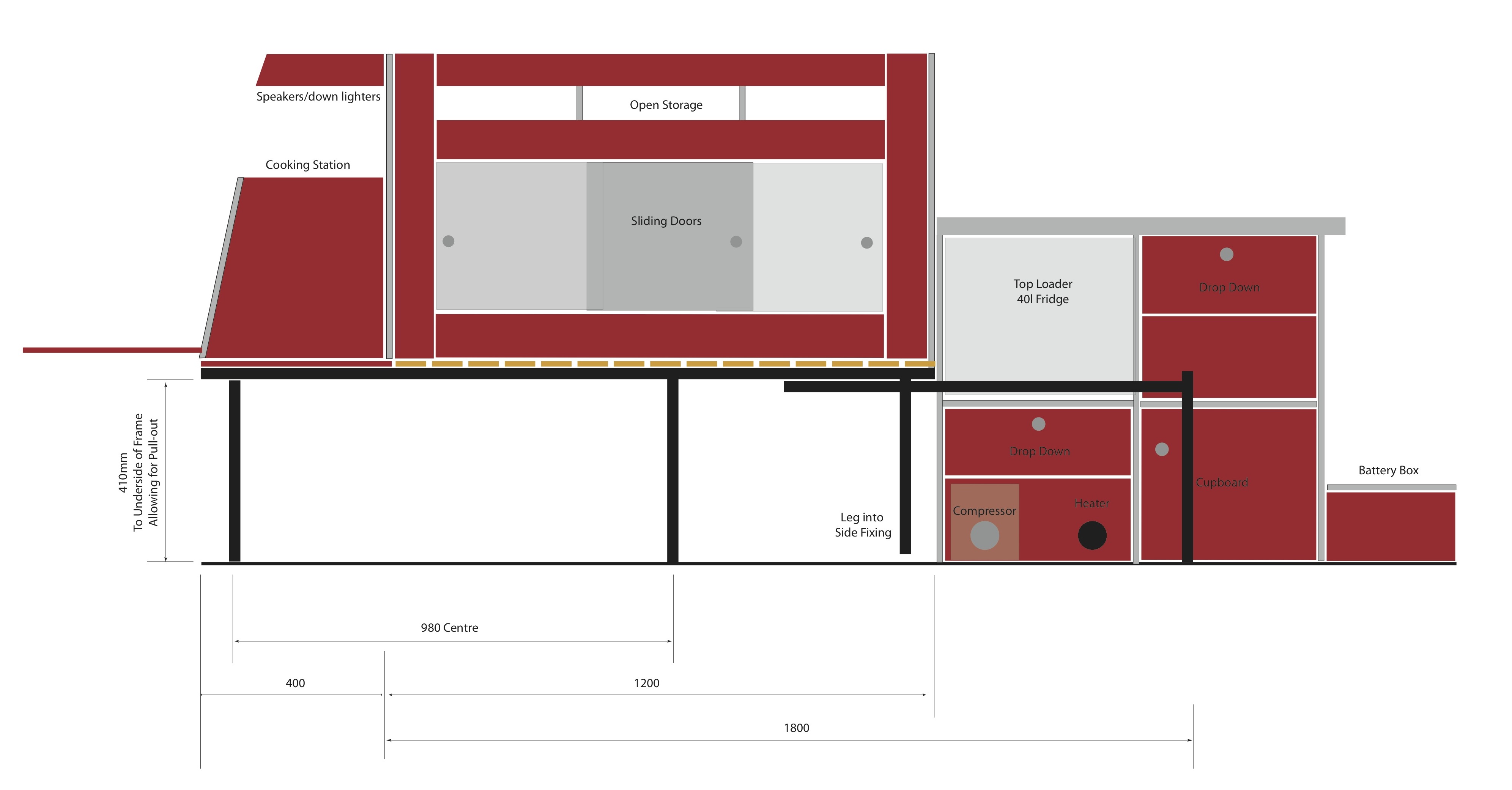 The final design was sketched up one unusually hot and sunny June Sunday afternoon sat in our garden armed with a nice bottle of wine and the internal dimensions of the van! A comfortable bed was a priority for us and, having tried the beds that roll out in the back of campervans, we dismissed that idea! We went for a permanent bed platform that is 2/3s full bed length, with an extension to pull out for the night to make it full length. This means that we cannot feel any seams or edges to the bed and we can have good support from the mattress. It also provides for a huge storage area underneath, good for all our climbing, trekking and scuba diving kit that we are travelling with!