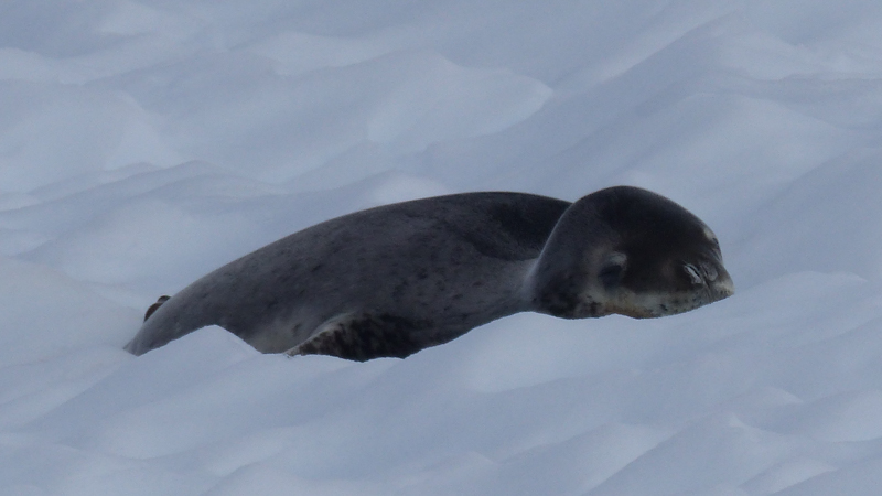 Leopard Seal lazily digests its lunch lying on the ice