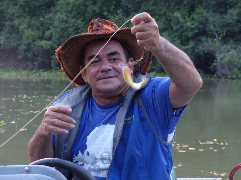 Our boat guide showing us how to catch Piranha