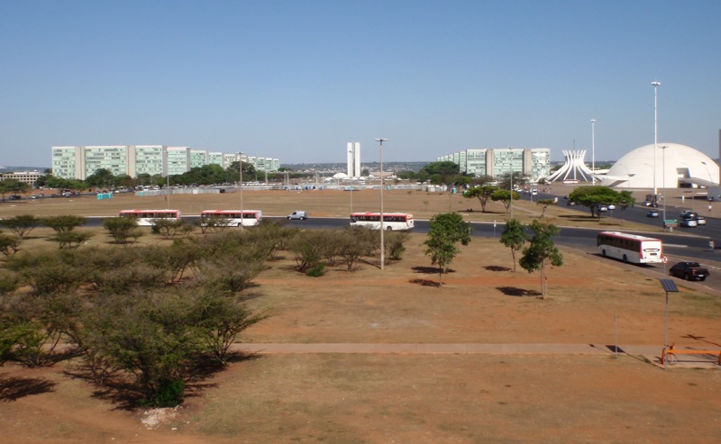 Looking down through the heart of Brasilia, along Exio Monumental, through the Esplanada dos Ministérios (ministry buildings on either side), towards the main seat of government
