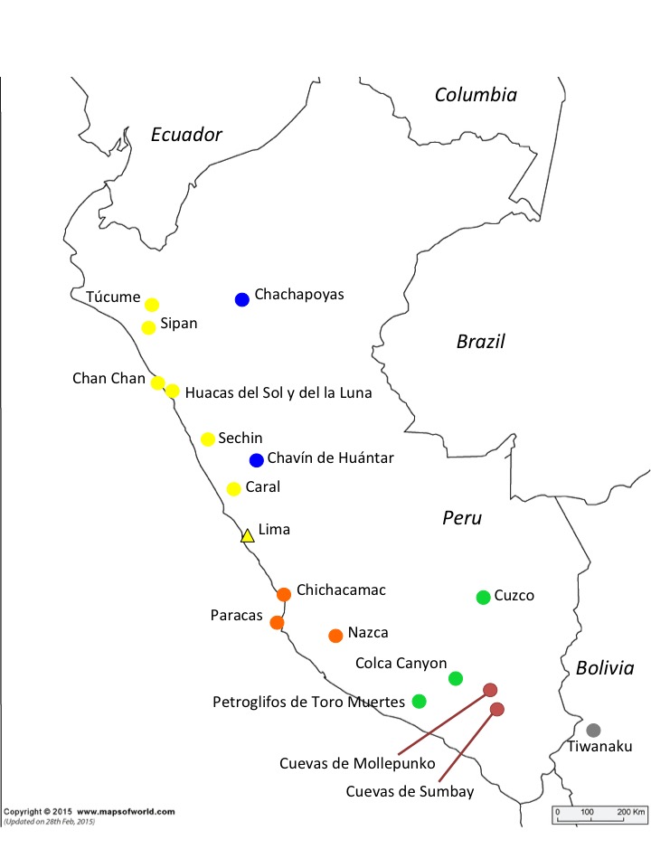 As geography and history seldom coincide linearly, this blog will travel through the cultures in a roughly historical order rather than the order that we encountered things – we thought it would be interesting to try and disentangle what we had seen for ourselves. Geographically, you can split the country roughly north-south along the coast, with Lima in the middle, and then also the inland, highland cultures, which culminated in the Incan Empire. There were a number of concurrent cultures and I have tried to surmise the ones we encountered both in a timeline of the cultures and a map of the archaeological sites: