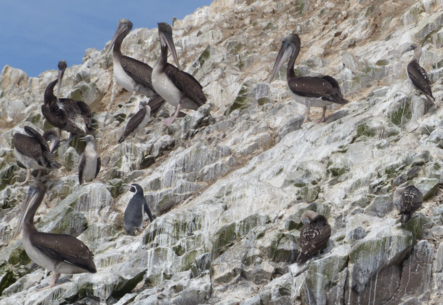 Pelicans surrounding a couple of penguins and Peruvian boobies