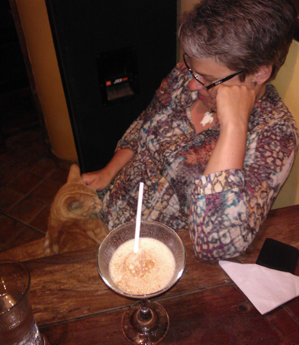 Relaxing with an algarrobina cocktail and another cat in Mancora