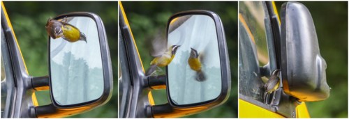 We did try to stop this Social (?) Flycatcher from attacking itself by closing our wing mirror!