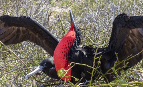 A Great(?) Frigate bird has successfully found a mate in the Galapagos