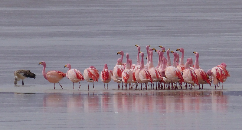Chilean Flamingos dancing, which is how they display during the breeding season. The lake here is at about 4,600m altitude and freezes overnight and freezes the flamingos in place