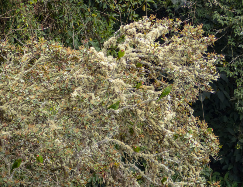 We heard these Scarlet-fronted (?) Parakeets long before we spotted them occupying this tree