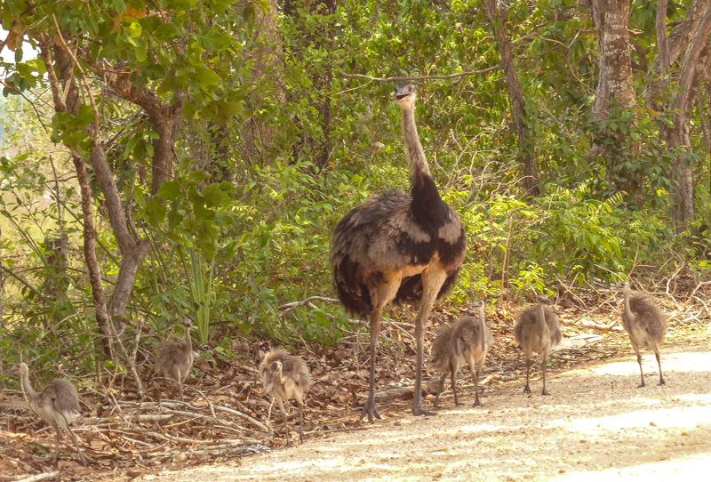 A family of Rhea walking wandering along the road in the Pantanal