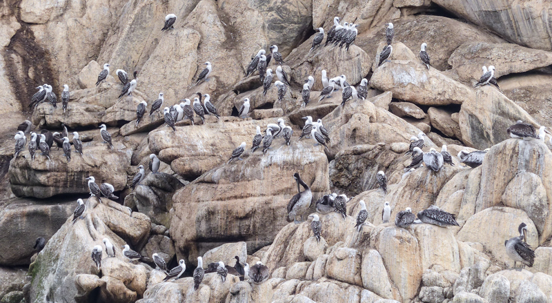Peruvian Boobys and Pelicans resting off the coast of Chile