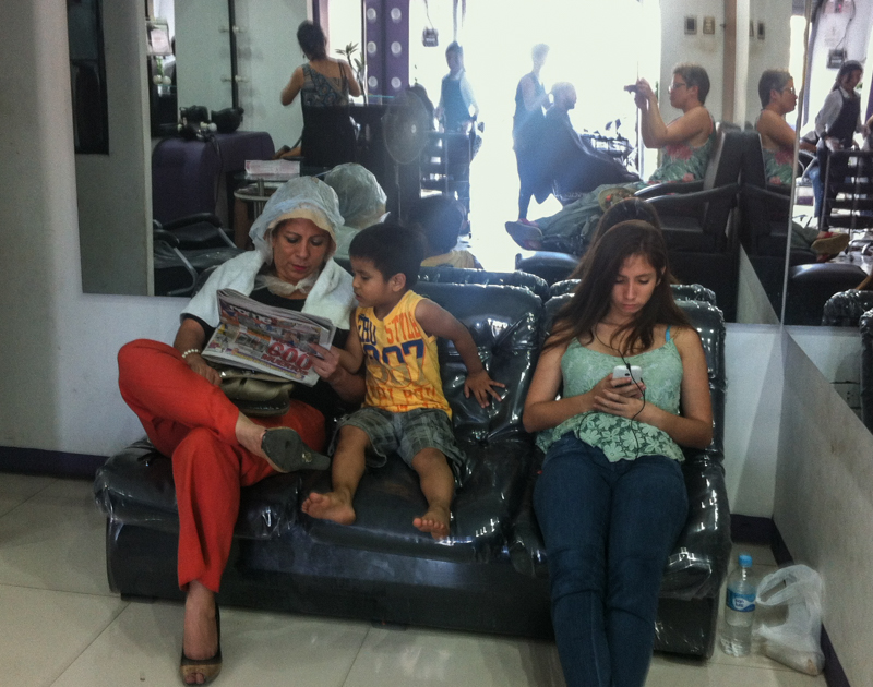 Haircut time! (Bruce is being cut, Rebecca waits in the pedicure chair)