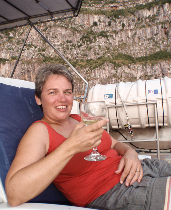 It was my birthday while on board and I celebrated by recuperating from a full day of 4 challenging dives at Wolf Island with a nice glass of wine on deck at sunset