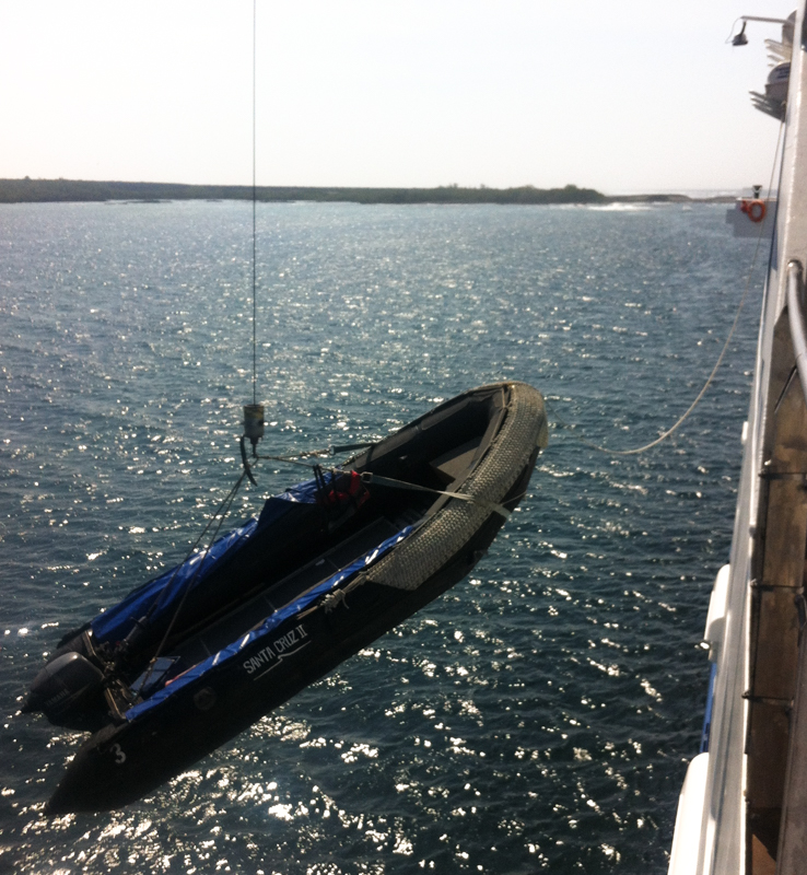 The tenders being hoisted onto the top deck for the night