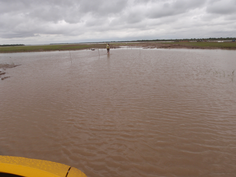 Confronted by the flooded river, the boatman waded out to lead us through the flood to where we could board his little ferry