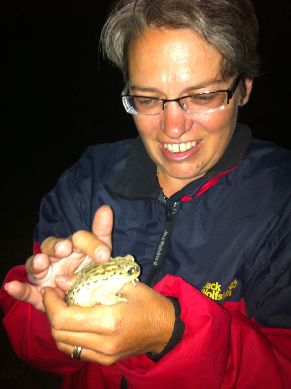 Becca befriends a frog by the gateway to the campsite