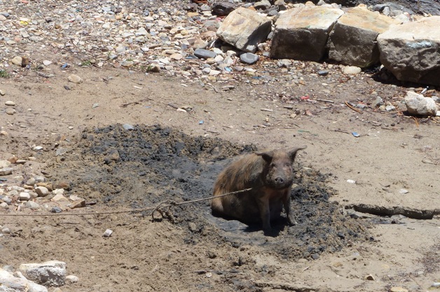 A pig enjoying its muddy spot on the lake shore