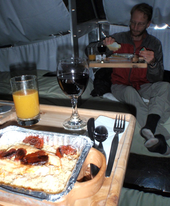 The guides, who stayed in another pod, prepared and brought over a lovely meal, including wine they had carried up for us!