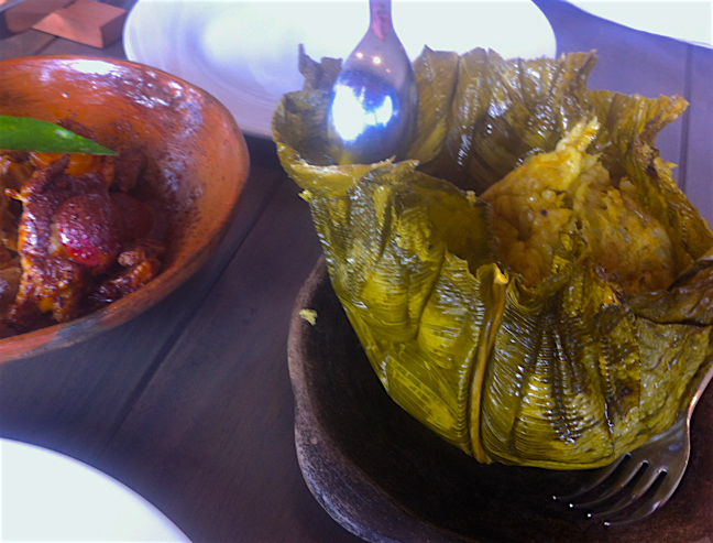 An hoja – parcel of rice and meats cooked in a leaf (with the rich duck dish to the side)