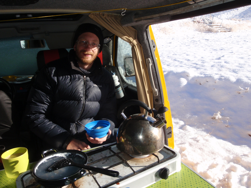 Catching the first rays of sun as they come over the hill during breakfast, despite the snow