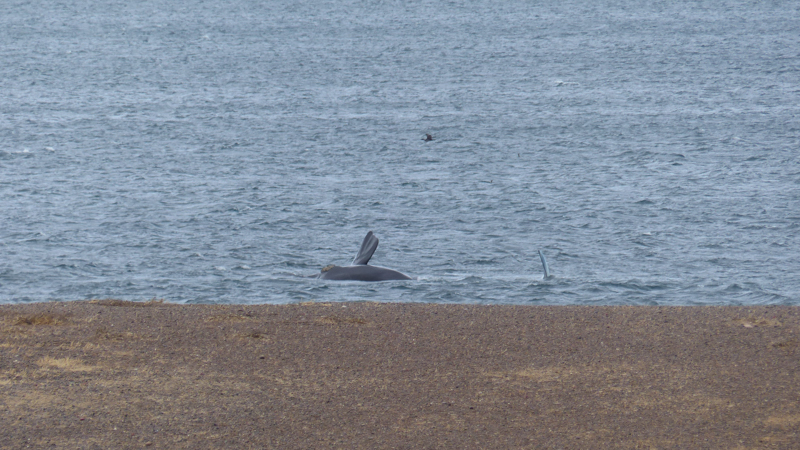 An unexpected lucky sighting of a Southern Wright whale and calf playing near the coast – most of their peers would have been much further south by then