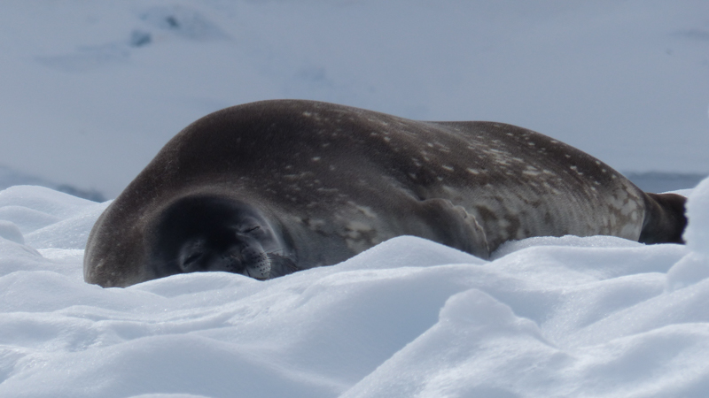 Nearby, a harmless Weddell Seal also sleeps of its lunch!