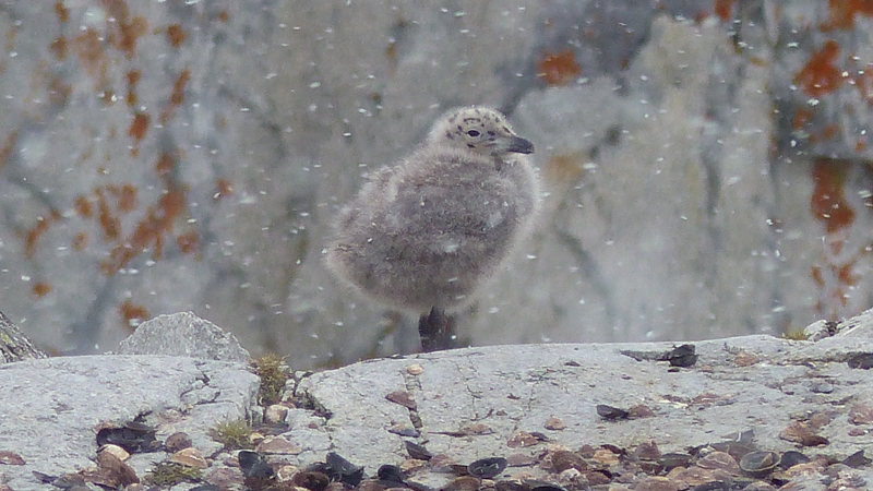 A gull chick looks like it’s managing to keep warm despite the snow