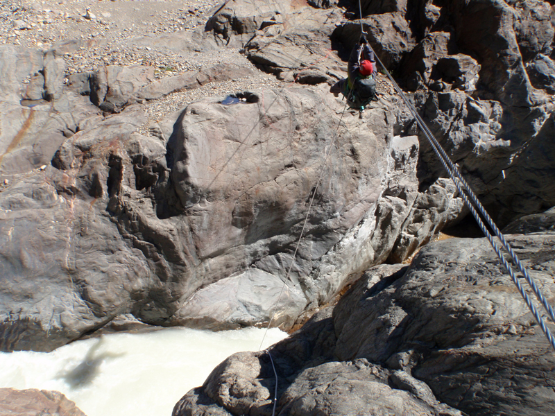 Wearing a harness, you clip onto a pulley on the cable and haul yourself across. Becca needed a bit of help from a tug on a rope to get all the way over – it was uphill in that direction!