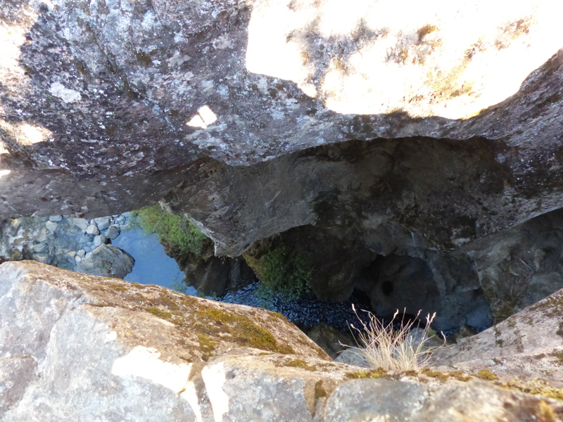 Which plunges deep below the gap in the rocks