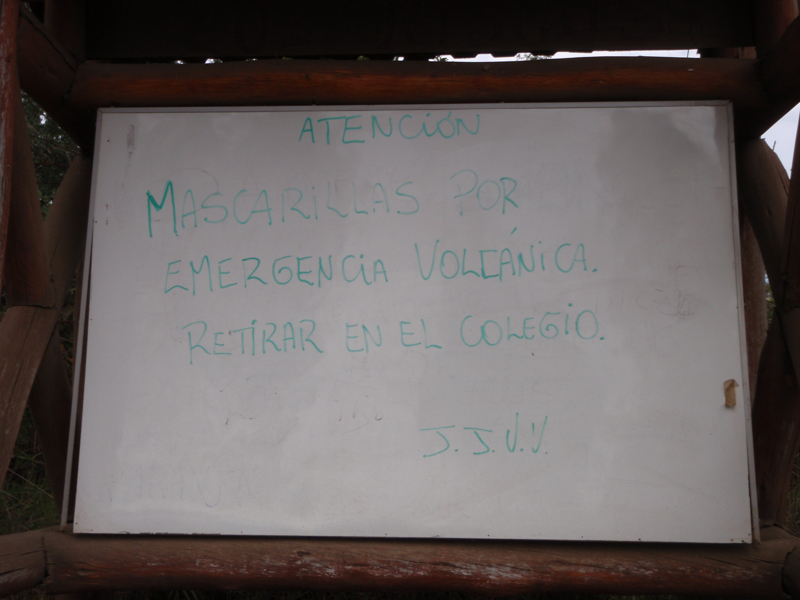 The volcano erupted a few weeks before – this sign informing residents where to get gas masks, reminds us of the realities